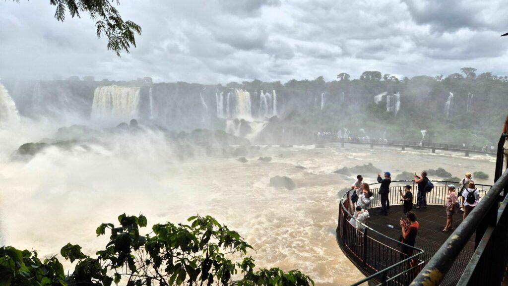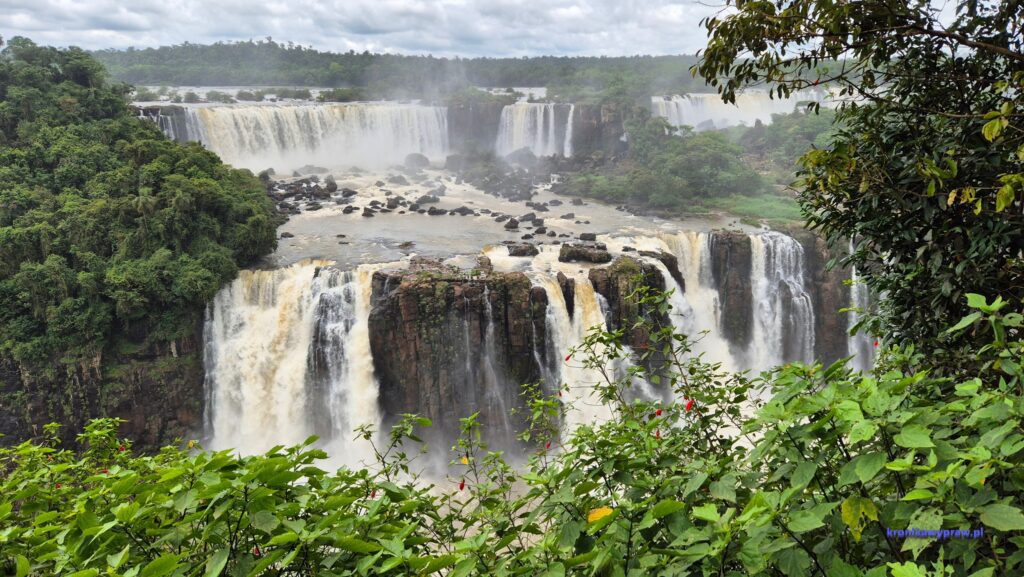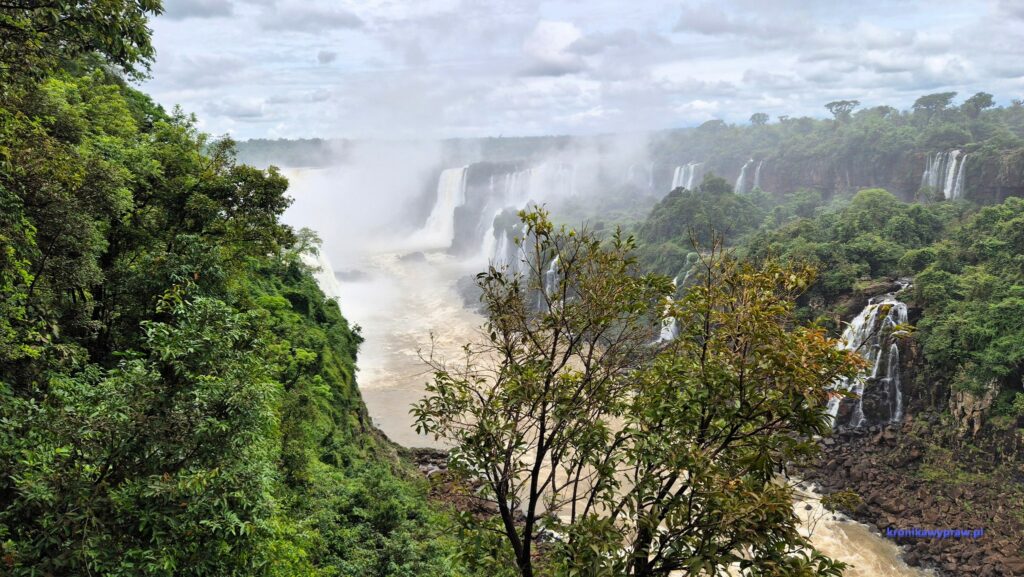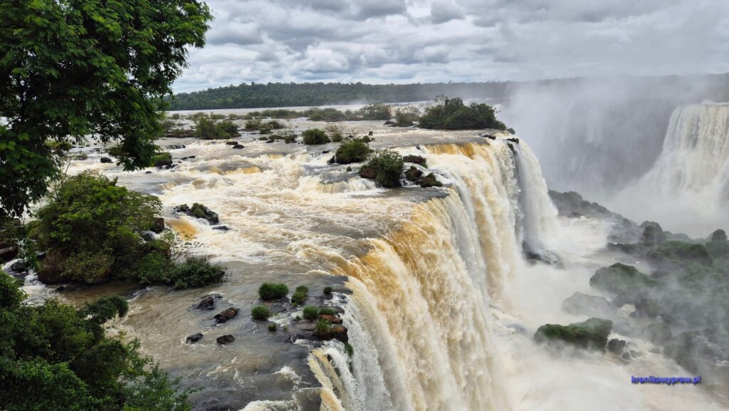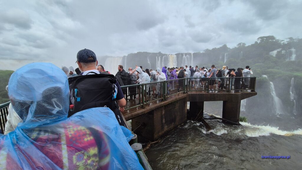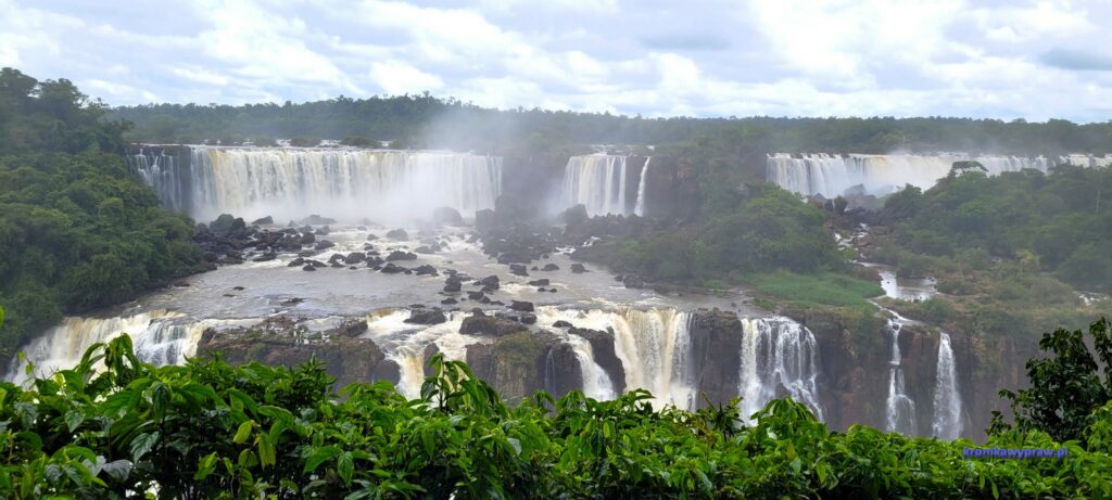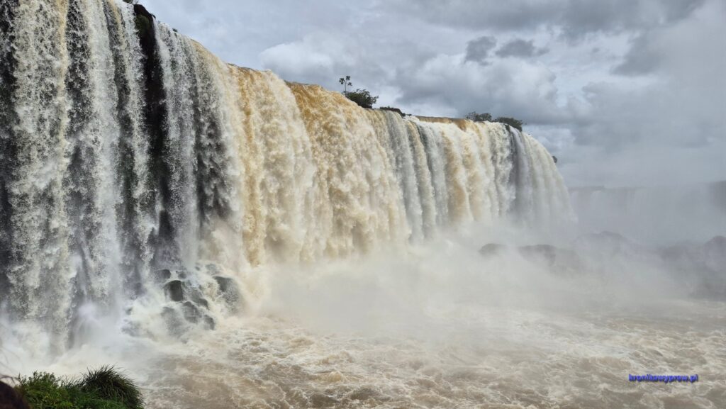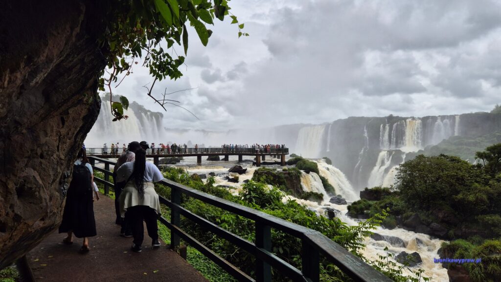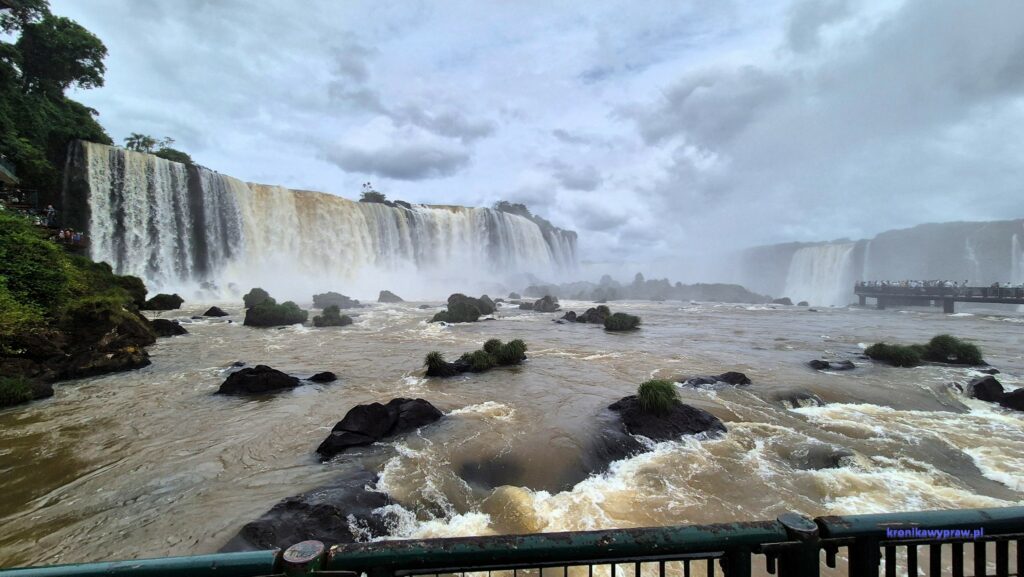 Zwiedzanie zaczynamy od wodospadów. Do bram Parku Narodowego z miasta dojeżdża autobus miejski za 5 reali (3,5 zł). Bilet do parku to ok. 80 zł. Od bramy parku do wodospadów dojeżdża się kolejnym autobusem (w cenie biletu). Po dojechaniu można przejść pomostami wzdłuż brzegu rzeki Iguazu mając takie widoki.